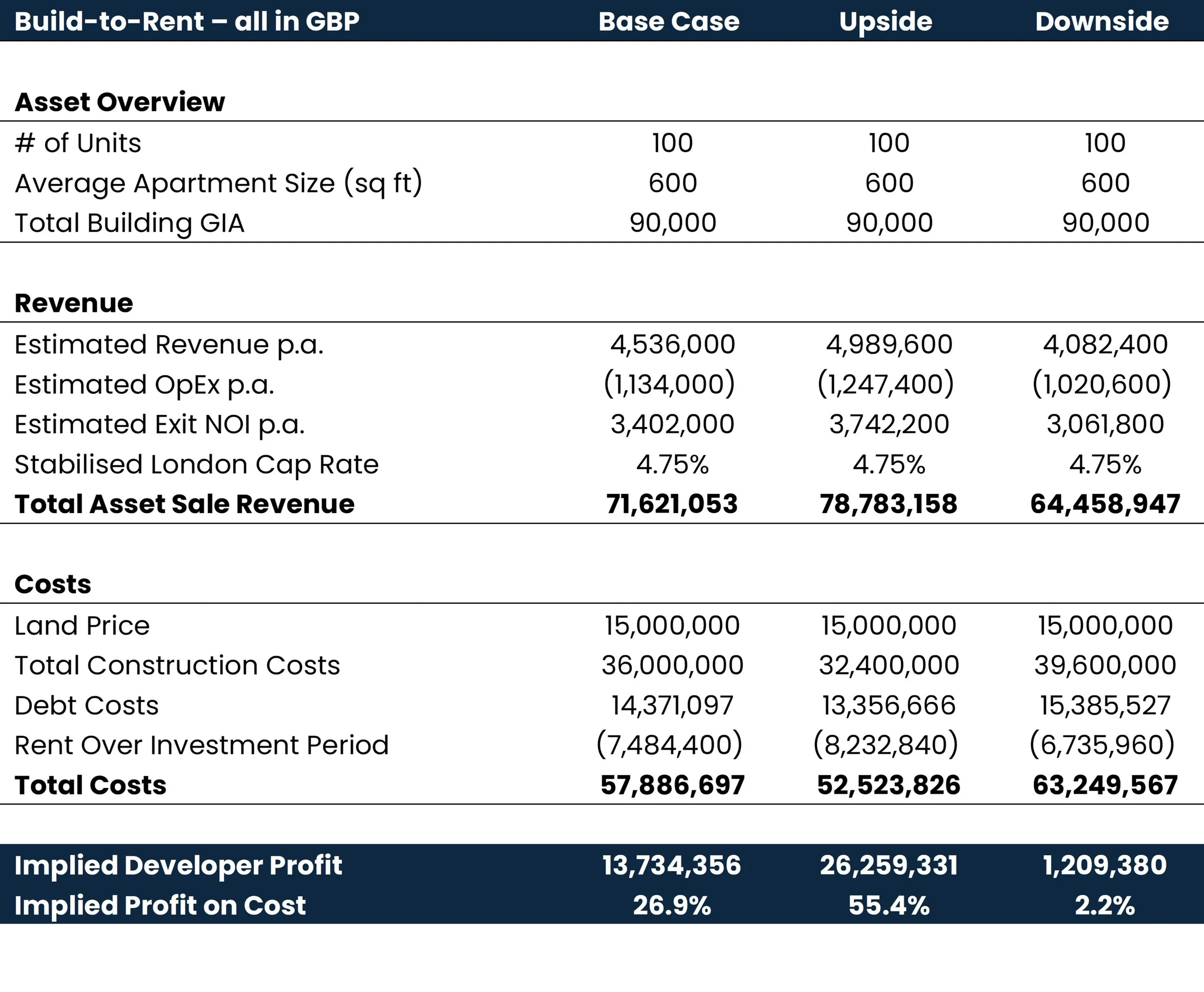 The analysis presented in this paper demonstrates that build-to-rent strategies can deliver materially superior returns compared with traditional build-to-sell models in markets where rental income and capitalisation rates are sufficiently strong. Across base, upside and downside scenarios, the BTR model produced higher implied developer profit, both in absolute terms and as a percentage of cost, driven by the fundamental mechanics of income capitalisation: every incremental unit of NOI translates into a significant multiple of asset value.